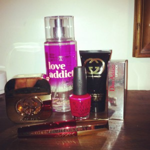Christmas beauty: Gucci Guilty perfume & lotion, Victoria's Secrets fragrance mist, OPI nails, Dior addict lipstick, L'oreal volume million mascara